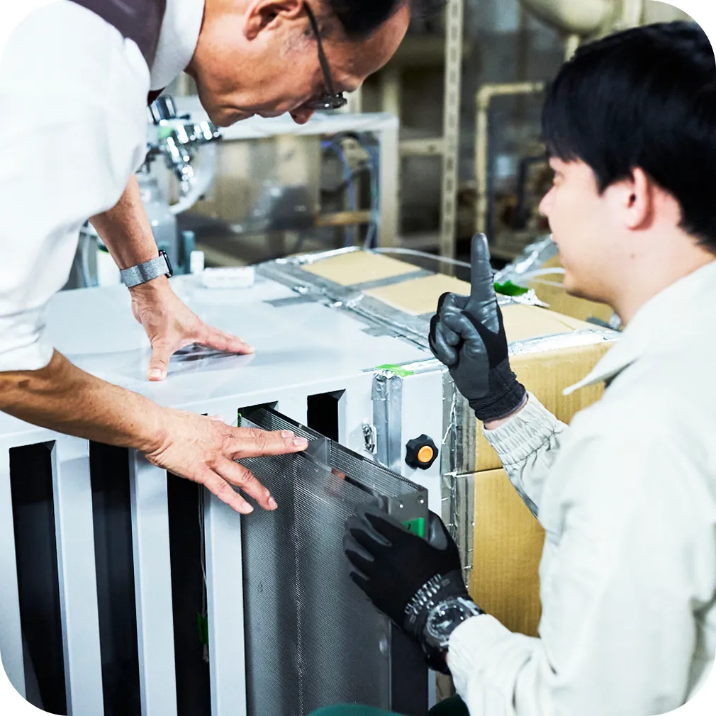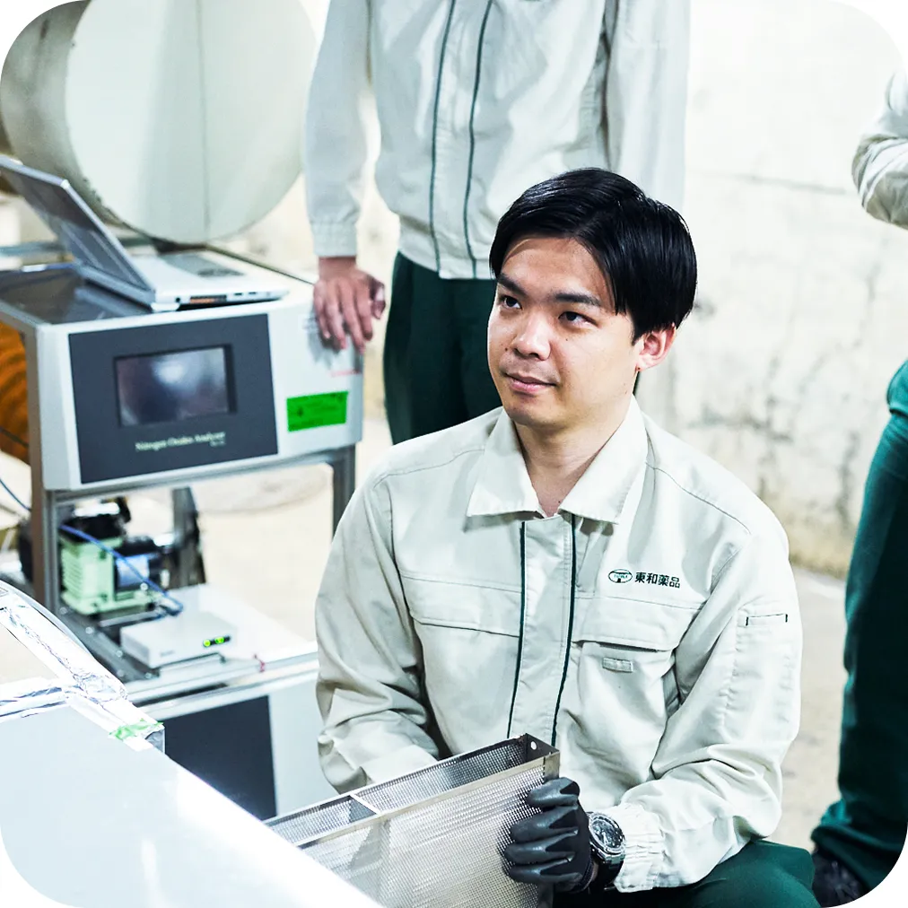 研究成果がすぐに実機に反映されて生産が行われ、実際にNOxを除去し、ニトロソアミン含有量の低い製剤を生産できた時には大きな達成感を味わいました。その一方で、実機への導入には現場との調整が不可欠です。特に生産現場からは「不確かなものを混ぜたくない」「生産量が落ちたらどうするのか」といった懸念が示されました。そこで、フィルターが安全であること、設備への影響がないことをデータに基づいて説明し、生産機の空調ラインにNOx除去フィルターを挿入するというこれまでにない試みを現場に受け入れてもらうために奔走しました。