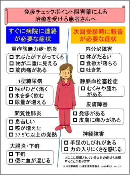 irAEの好発時期は明らかでなく、ICI投与終了数か月後も発現する可能性がある。外来でのICI投与が多い状況で、自宅において患者自身がirAEの自覚症状に気付き、適切に対応できることが求められる。そこで、チームICIでは自覚症状について患者の理解を向上させるべく、患者教育シートを作成した。