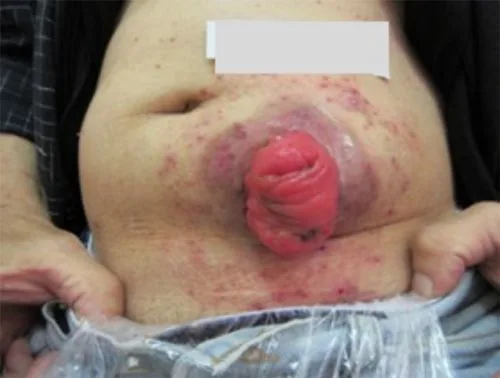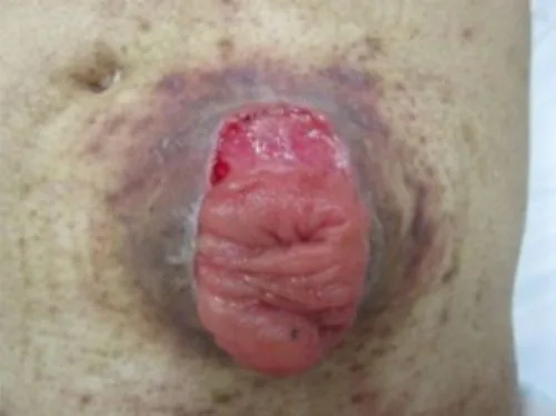 ストマ装具のずれによる潰瘍の新生(図3)。