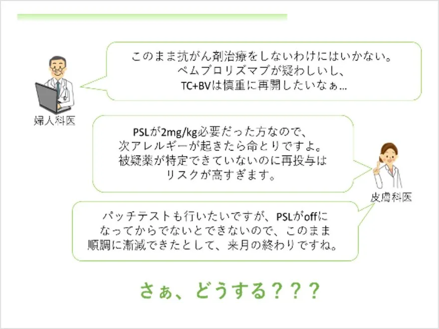 ① 子宮頸がんⅣ期で初回治療として4剤併用療法をしたところ、Day8より皮疹が出て、SJS症候群と診断され、ステロイドパルスを行った。皮膚症状は改善方向で、1クール後の治療効果はPR。がんの病状としては、かなり進行した状態で、初回治療がせっかく効いているので、間髪入れずに次クールに入りたい。TCだけでも再開できないか?(図6)