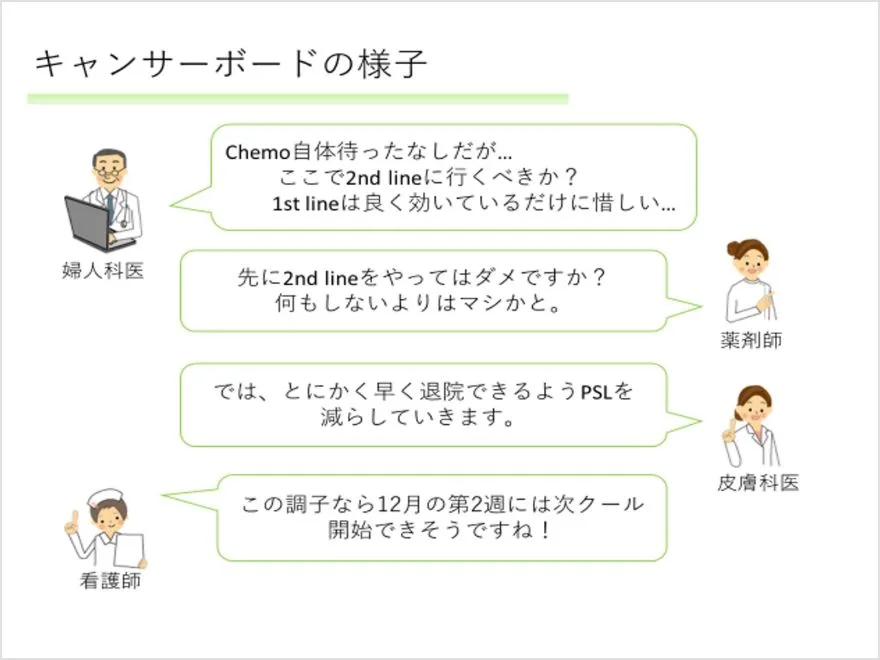 ② 皮膚科と主科および腫瘍内科・関連スタッフでの協議が必要と思われるため、薬剤師から関係者に連絡して、キャンサーボードを開催した。