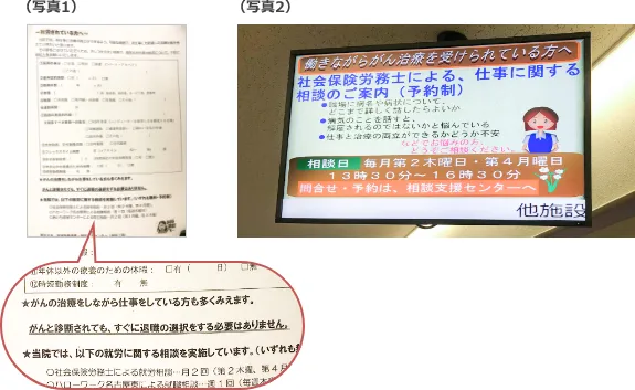 また、すべての診療科で使用する初診時の問診票に就労に関するページがあり、そこに「がんと診断されても、すぐに退職の選択をする必要はありません」というメッセージと院内でのサポート窓口のお知らせを載せている(写真1)。さらに、待合室のモニターにも就労支援の窓口があることを掲示し(写真2)、来院された方の目につくように工夫している。