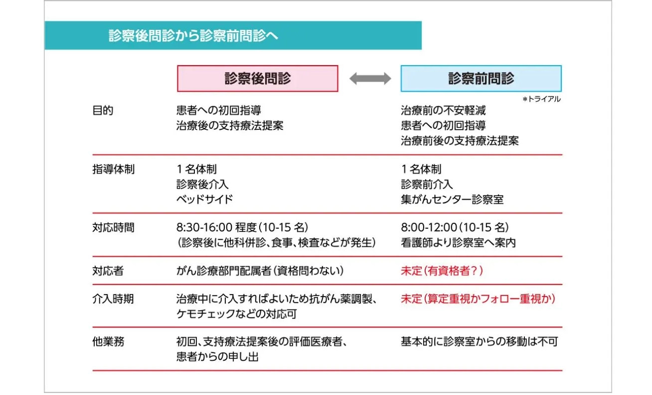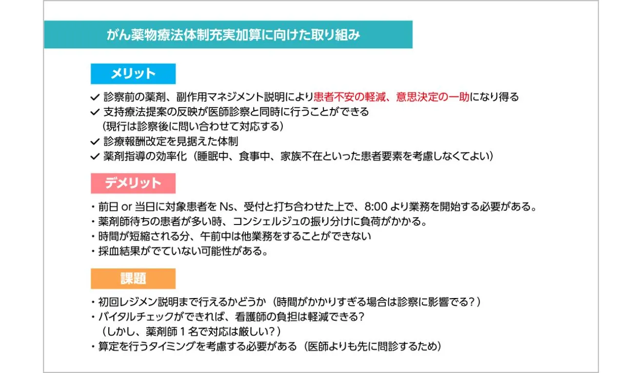 がん薬物療法体制充実加算の算定に向けて、2024年1月よりラウンド業務の薬剤師外来を試験的に診察前問診に移行している。問診場所は、化学療法室前にある診察室に設け、看護問診後にコンシェルジュが薬剤師外来に案内する形で行っている。