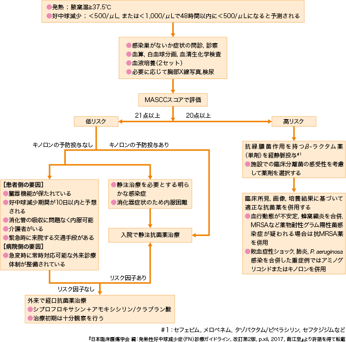 - 参考: 日本臨床腫瘍学会 編集.: 発熱性好中球減少症(FN)診療ガイドライン(改訂第2版). 南江堂. 2017