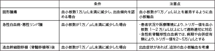- 血小板数<1万/µLの場合、血小板輸血を検討する。ただし、出血リスクが高い場合や血小板製剤入手に制限がある場合は血小板数<2万/μL、治療前の急性前骨髄球性白血病では病態によって血小板数2〜5万/µLで輸血するなど、患者の状態等により柔軟に対応する。