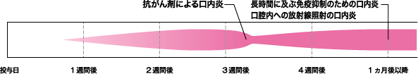 - 抗がん剤による口内炎は投与数日~10日目頃に発症することが多い。分子標的薬は服用開始後2週目頃から発現頻度が増加する。その後、2~3週間で徐々に改善し、予後は良好である。ただし、予後を良好にするためには服用中止もしくは適切な対処が必要であり、服用を継続している間は、十分な対策を心掛ける。