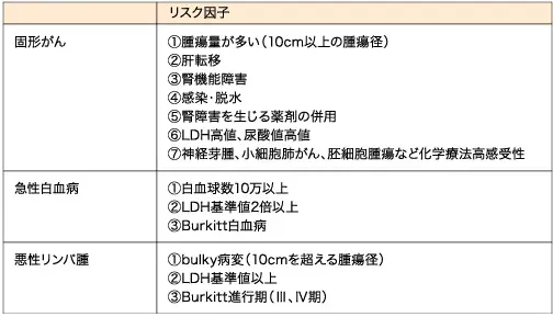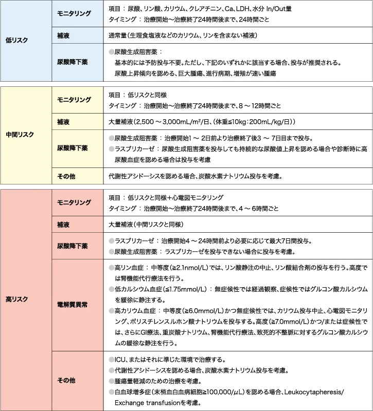 - 通常の採血では、尿酸及びリンは検査していない場合が多い。治療開始前に、必要な項目(尿酸、リン、カリウム、カルシウム、血清クレアチニン、LDH)を含む血液検査を実施し、治療とともに予防対策を計画する。